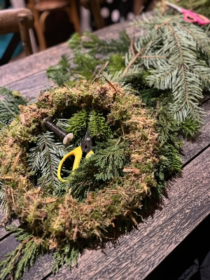 Don’t worry - no experience is necessary as Anna will be able to guide you along the way. All foliage and materials are provided to make a natural moss based wreath, with natural accessories like pine cones and cinnamon sticks. We just ask you to bring your own scissors and apron (or old top).