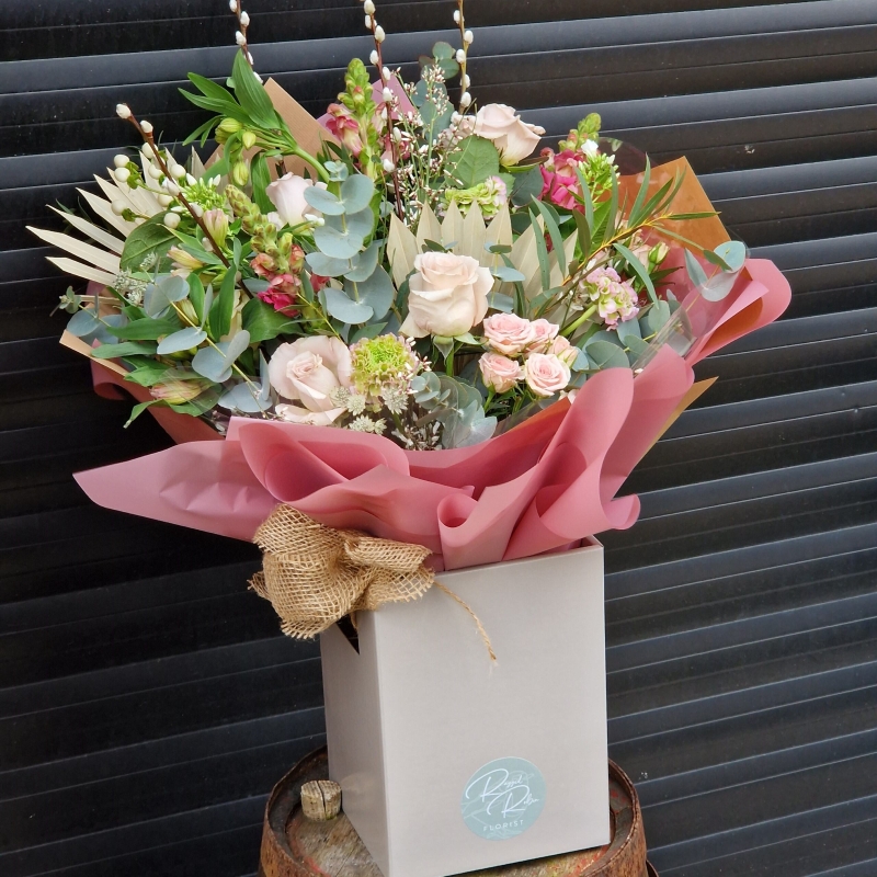 Our Rosewood Whisper bouquet is a beautifully curated arrangement of soft nude and blush tones, featuring stunning roses, fragrant eucalyptus, and carefully selected seasonal blooms. Designed with a natural, garden-inspired feel, it blends delicate textures with elegant structure for a truly timeless look.