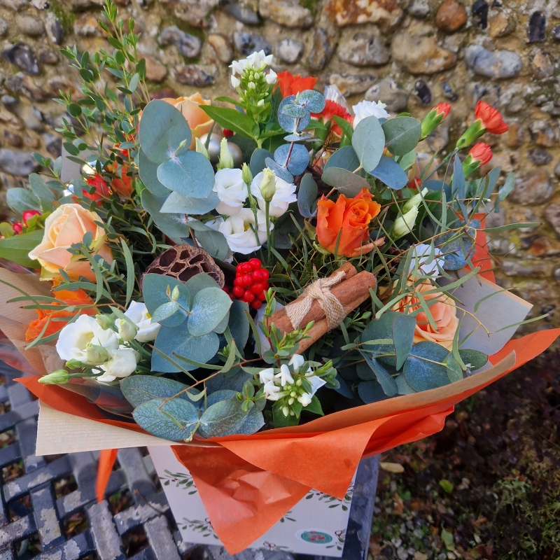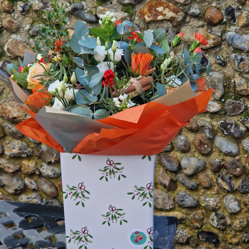 Our Orange Ember bouquet glows with the warmth and joy of the festive season. A radiant blend of orange roses and crisp white blooms is wrapped in aromatic eucalyptus, fragrant cinnamon, and bright red berries — capturing the cozy sparkle of Christmas gatherings and fireside moments. Handcrafted with care, this bouquet brings a lively burst of colour and seasonal charm to any home, making it the perfect gift for spreading cheer and brightening winter days.
